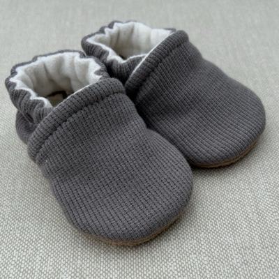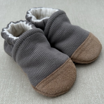 Snow and Arrow is proud to offer basic solids in a wide variety of colors. These slippers are made from high quality Birch brand organic cotton knit. The inner is fully lined in organic cotton fleece and leather soles offer a non-slip slipper for your little one. Hardwood and tile floors are no problem with Snow and Arrow! The elastic ankle is designed to easily go on and gently hug your little one's ankle, but best of all they are going to stay on wiggly feet!