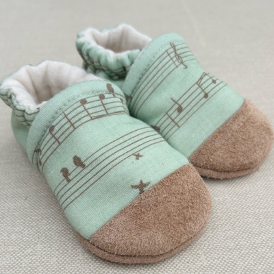 This Snow and Arrow slipper is crafted from 100% organic cotton knit outer and is fully lined with 100% USA grown and milled organic cotton fleece and features a non-slip leather sole. Hardwood and tile floors are no problem with Snow and Arrow!  Our special elastic ankle is designed to easily go on and gently hug your little one's ankle, but best of all they are going to stay on wiggly feet!